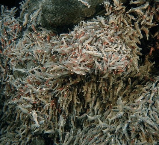 This species of shrimp, scientifically known as Rimicaris exoculata, lives up to 5,000 metres below the ocean surface, and are found in swarms around volcanic hydrothermal vents in the Mid-Atlandtic Range, where temperatures can exceed 400 degrees Celsius. Hydrothermal vents are close to an underwater volcano that generates heat as well as geological and chemical activity important for the development of certain life forms, such as the Deep Sea Shrimp. The water surrounding the chimney walls is a lot cooler, usually between 10 and 15 degrees Celsius.